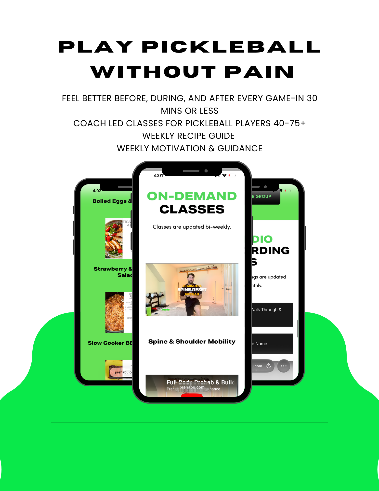 Prehab 365 gives you structured strength and mobility workouts, daily Prehab exercises, recovery sessions, quarterly fitness and nutrition challenges, and a supportive community to help you stay strong, mobile, and pain-free all year!